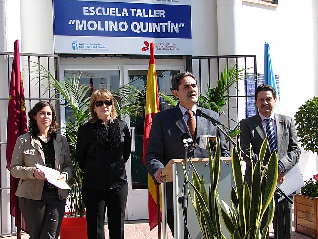En su intervención, Carmen Honrubia ha destacado que “la implicación en este proyecto es máxima, la Escuela Taller era una promesa electoral del Equipo de Gobierno, ahora cumplida y, como concejala de Juventud puedo asegurar que además de aprender un oficio, aquí se forman personas, por eso, aprovechando la presencia del Subdirector del SEF, quiero pedirle para San Pedro del Pinatar, la Talleres de Empleo, nuestros jóvenes se lo merecen”. Tras ella, Rafael Olivares, agradeció la invitación a la inauguración de la Escuela Taller “es un placer volver a San Pedro del Pinatar, yo nací y viví aquí y es una satisfacción comprobar todo lo que está avanzando la localidad. El programa de Escuelas Taller en términos económicos son muy caros y suponen para el SEF un esfuerzo social importante por eso los jóvenes que participan en este proyecto, deben ser conscientes de la suerte que han tenido y aprovechar la oportunidad que os brinda la concejalía de Juventud”. Por último, el alcalde, José García Ruiz, recordó en su intervención que “en esta Escuela Taller se han creado un total de 32 puestos de trabajo y se recibe una subvención de 724 mil euros y 12 mil aportados por el Ayuntamiento que revierten en el bienestar de los pinatarenses, por eso, en la coyuntura socio-económica en la que nos encontramos, podemos sentirnos orgullosos de tener en el municipio un proyecto como la Escuela Taller “Molino Quintín”.