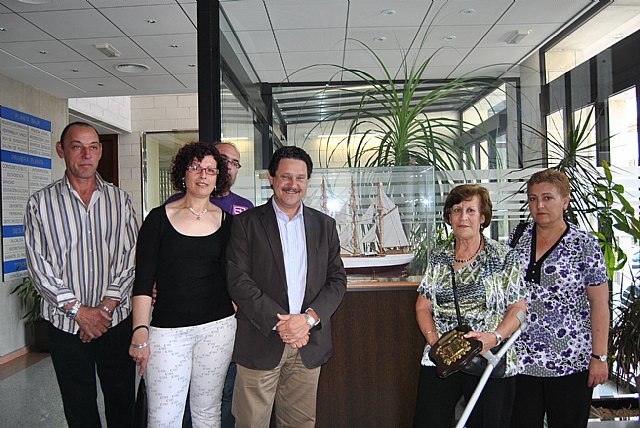 Ambrosio Imbernón era un querido vecino de San Pedro del Pinatar que dedicaba parte de su tiempo a diseñar y construir con sus hábiles manos, maquetas navales. La familia, reunida en el hall del Ayuntamiento donde recibieron de manos del Alcalde, José García Ruiz, una peana con el escudo de la Villa, agradecieron que una de esas maquetas que en su día la viuda, Josefa Imbernón, donó al Consistorio, adorne la entrada lateral y se exponga, como siempre quiso Ambrosio, a los ojos de los vecinos como ya se hiciera con motivo del I Centenario de la Romería de la Virgen del Carmen.