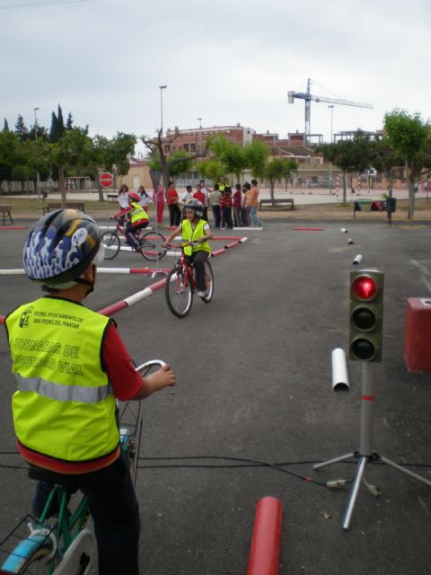 La Unidad Especial de Policía Tutor perteneciente a la Policía Local de San Pedro del Pinatar, está realizando unas jornadas de Educación Vial en todos los centros escolares de primaria del municipio. Dicha actividad denominada "Semana de la Educación Vial", se divide en dos partes, una clase teórica, donde los alumnos aprenden cómo deben comportarse cuando circulan por la vía, tanto en bicicleta como de peatón, haciendo hincapié en aquellas señales básicas que deben conocer y que son de obligado cumplimiento para todos los usuarios de la vía. La segunda parte de la actividad, consiste en aplicar lo aprendido en la práctica, para ello, en los centros escolares se monta un circuito infantil de tráfico, facilitado por la JPT, el cual cuenta con carriles de doble sentido, cruces con semáforos, una rotonda y todas aquellas señales principales que deben conocer. Las clases se dividen en dos grupos, donde la mitad de los alumnos van subidos en bicicletas circulando por todo el circuito y la otra mitad circulan como peatones, debiendo respetar las señales que se van encontrando durante el recorrido. Los alumnos que suben en bicicleta, van dotados de un chaleco reflectante y de un casco de seguridad, explicándoles los agentes adscritos a la Unidad Especial de Policía Tutor, la importancia de la utilización de dichos elementos.