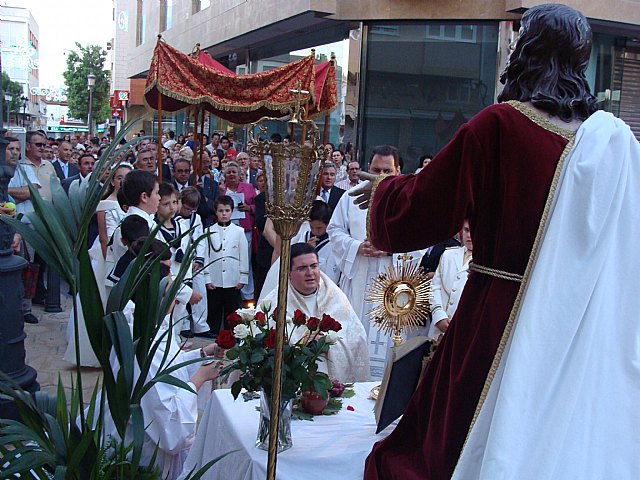 Las cofradías de San Juan, Santiago y el Cristo del Perdón, la asociación de la Virgen del Carmen y fieles del municipio montaron ocho altares por diferentes puntos del municipio para recibir la sagrada forma, símbolo del Cuerpo de Cristo, portada por el párroco del municipio, Roberto García, que procesionó bajo palio.