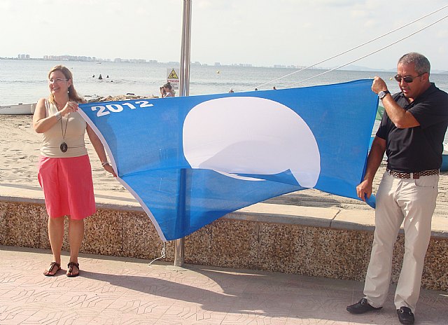 La alcaldesa de San Pedro del Pinatar, Visitación Martínez, y el concejal de Turismo, Antonio García, han izado hoy la bandera azul otorgada a la playa de La Puntica de Lo Pagán.