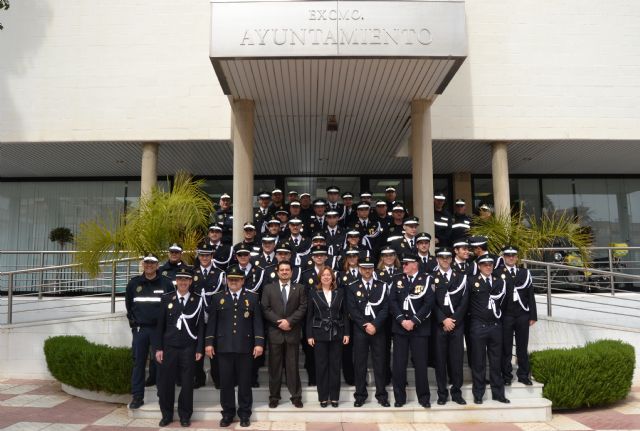 La alcaldesa de San Pedro del Pinatar, Visitación Martínez, y el concejal de Policía, Jerónimo Moya, pasaron revista a los 52 miembros del cuerpo de la Policía Local, que celebraron el día de su patrón, San Patricio, con un acto institucional en el salón de Plenos del Ayuntamiento.