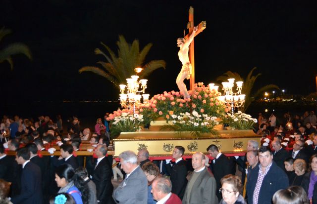 El Cristo del Mar Menor, portado por 40 estantes, procesiona por las principales calles de la pedanía costera representando las 14 estaciones del Vía Crucis y su mayor atractivo es que gran parte del recorrido se realiza en paralelo al mar.