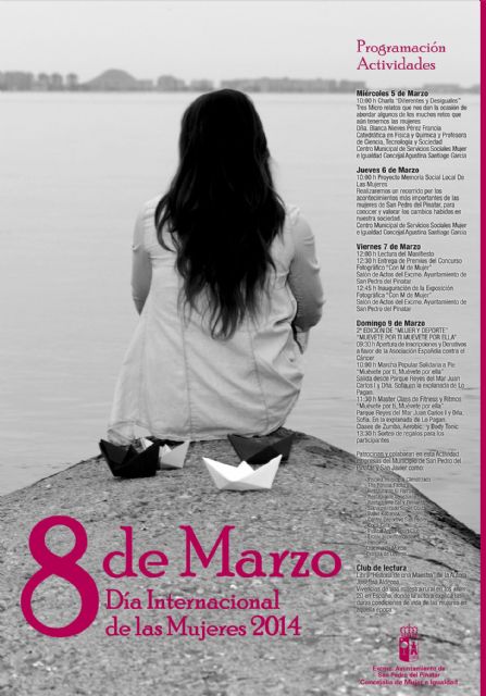 El Ayuntamiento de San Pedro del Pinatar celebra este año el Día Internacional de la mujer con diversas actividades como nuevas actividades, exposición de fotografía una charla sobre igualdad, y la segunda edición de las jornadas Mujer y Deporte, a beneficio de la Asociación Española contra el Cáncer.