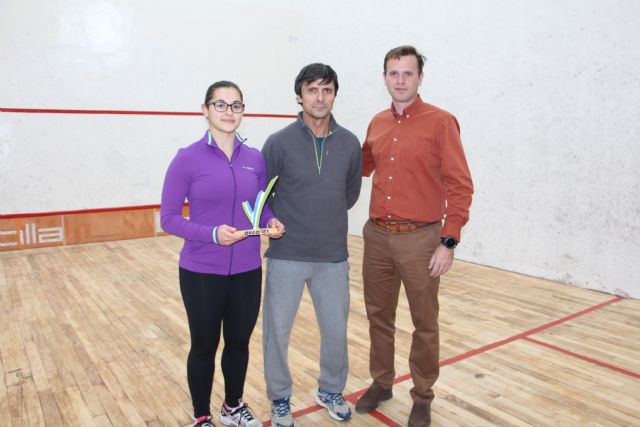 La jugadora de squash pinatarense, Cristina Gómez Jiménez, ha recibido esta tarde de manos del concejal de Deportes de San Pedro del Pinatar, Daniel Pérez, un obsequio con el cual el Ayuntamiento de la localidad quiere felicitarla por haberse proclamado recientemente campeona de España absoluta de este deporte.