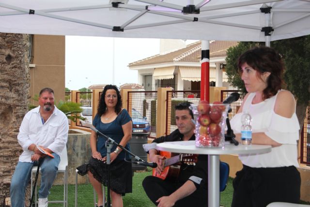Los versos de Gema Bocardo, Carlos S. Olmo y María José Navarro, acompañados por la guitarra flamenca de Fran Andreo, abordaron temas como el dolor, el deseo y el amor en el jardín de la Casa de la Cultura de San Pedro del Pinatar.
