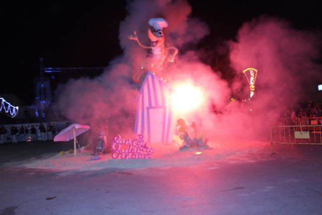 La quema se produjo en un descanso del Concurso de Talentos que celebraba su segunda semifinal. Esta noche viviremos la gran final del mismo a las 22:30h en el recinto de peñas y posteriormente habrá una fiesta Remember organizada por la emisora local Radio Pinatar y que reunirá a algunos de los Dj,s que marcaron tendencia en la década de los 90.