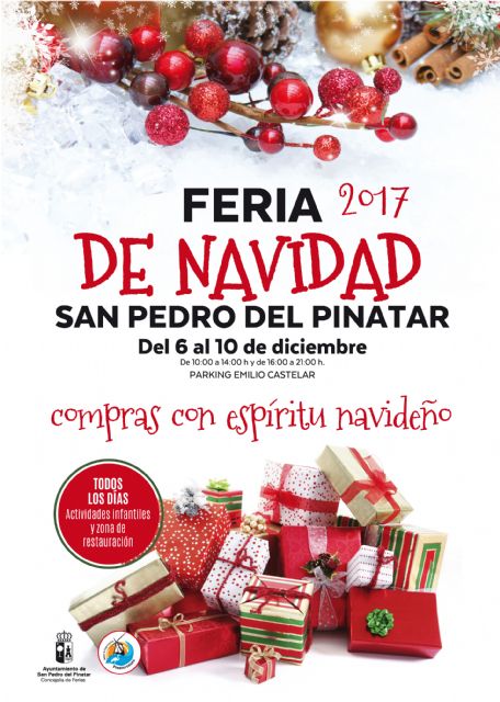 La VI Feria de Navidad de San pedro del Pinatar, en la que participan una treintena de expositores, se celebrará del 6 al 10 de diciembre en el recinto instalado en el aparcamiento de la avenida Emilio Castelar, en horario de 10:00 a 14:00 y de 16:00 a 21:00 horas.