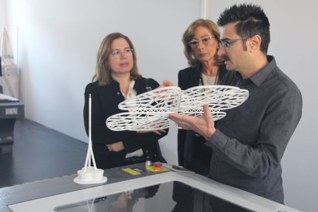La alcaldesa de San Pedro del Pinatar, Visitación Martínez, y la concejal de Educación, Guadalupe García, han podido ver un prototipo de estas sombras, elaborado por el estudio Genneo Arquitectura y Diseño, con la innovadora tecnología de impresión en 3D, técnica en la que son pioneros a nivel regional.
