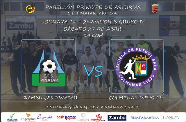 Tras el parón de competición por la Semana Santa, la 2ª División B retoma su actividad, en una jornada en la que Zambú CFS Pinatar recibe a EFS Colmenar Viejo el sábado a las 19 horas en el Pabellón Príncipe de Asturias.