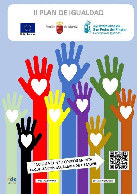 Los ciudadanos que quieran aportar su opinión sobre la igualdad de oportunidades en el municipio pueden hacerlo a través de un sencillo cuestionario, al que pueden acceder a través de un enlace web o un código QR que encontrarán en la web municipal (hasta el 19 de octubre) y enviarlo por email: igualdad@sanpedrodelpinatar.es