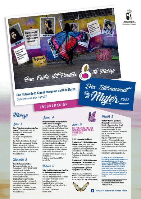 Las actividades se podrán seguir en las redes sociales oficiales de la Concejalía de Igualdad y del Ayuntamiento de San Pedro del Pinatar. Todos los eventos relacionados con el Día Internacional de la Mujer han sido organizados por la Concejalía de Igualdad y en colaboración con las Concejalías de Empleo y Bienestar Social.