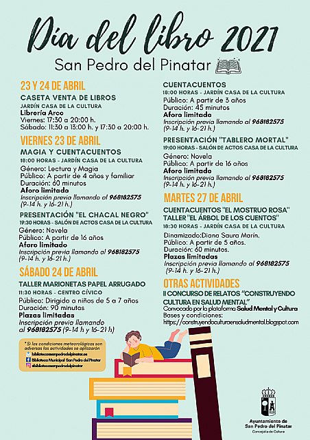 La concejalía de Cultura conmemora este año el día del Libro con una programación adaptada a las restricciones sanitarias centrada en la animación a la lectura con los más pequeños y la difusión de obras de autores de la Región