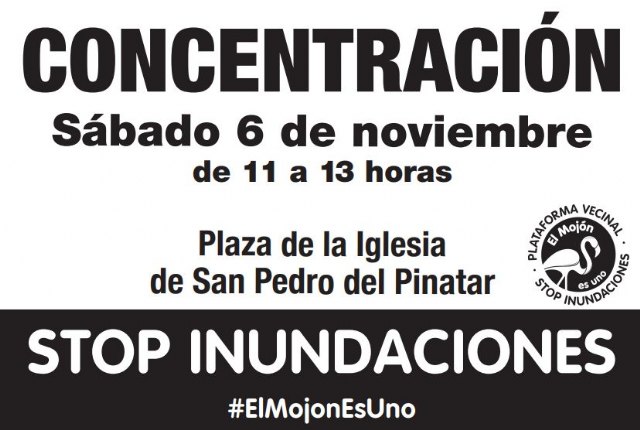 El próximo sábado 6 de noviembre de 11 a 13 horas habrá una concentración en la plaza de la Iglesia de San Pedro del Pinatar convocada por la Plataforma Vecinal Stop Inundaciones EL Mojón Es Uno.
