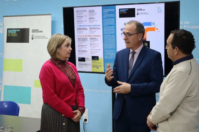 La concejal de Educación de San Pedro del Pinatar, Carmen María López, y el jefe de zona de Caja Rural Central, Francisco Fernández, presentaron en rueda de prensa la oferta formativa de la Universidad Popular, que se compone de 63 cursos en diferentes áreas como educación, idiomas, nuevas tecnologías, formación para el empleo o desarrollo personal.