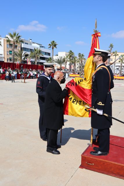 La explanada de Lo Pagán ha acogido esta Jura de Bandera Civil, en un acto presidido por el Almirante Jefe del Arsenal de Cartagena, Pedro Luís de Lapuente García Ganges, y la alcaldesa de San Pedro del Pinatar, Visitación Martínez Martínez.