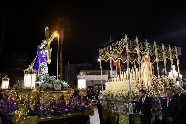 La procesión del Encuentro de Jesús con su Santísima Madre en la Calle de la Amargura en la que participan los tronos de Jesús Nazareno, la Virgen de los Dolores, Piadosa Mujer Verónica y San Juan Evangelista, volvió a congregar a miles de fieles en uno de los momentos más importantes de la Semana Santa Pinatarense.