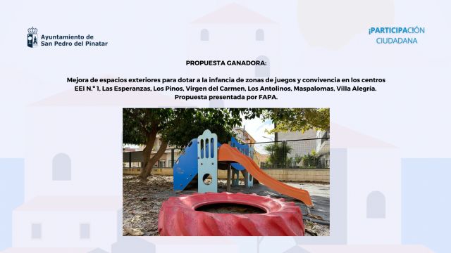 La propuesta más votada en los Presupuestos Participativos de 2024 ha sido la "Mejora de los espacios exteriores de los colegios públicos, para dotar a la infancia de espacios de juego y convivencia", presentada por la Federación de Asociaciones de Padres y Madres de Alumnos, FAPA Pinatar.