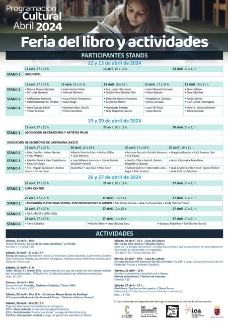 Esta Feria del libro se cerrará los días 26 y 27 de abril con los autores Ana Verdú Conesa, Ana Fructuoso Ros, Zaida Sánchez Terrer, Tomy Ceballos, Mariló Vélez, José Sánchez Sanz, Soledad Martínez y Toñi Gómez García.