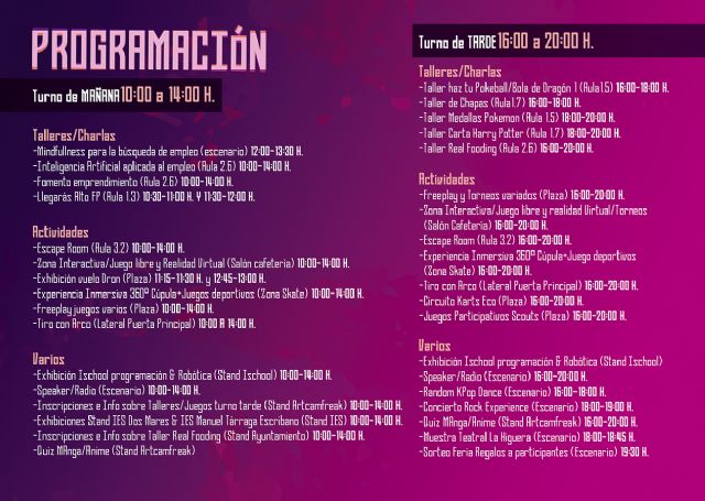 Se realizará un Taller de Emprendimiento a lo largo de la mañana realizado por Antonio Samper, joven emprendedor de la localidad y CEO de Dronemur, y un taller sobre la aplicación de la Inteligencia Artificial para la búsqueda de empleo, impartido por Francisco Javier Medina, CEO de Social Revolution. Además, Acción contra el Hambre impartirá un taller de mindfulness centrado en la búsqueda de empleo.