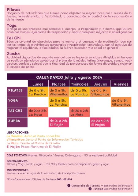 Durante los meses de julio y agosto, la concejalía de Turismo de San Pedro del Pinatar ofrece actividades deportivas dirigidas de pilates, yoga, tai chi y zumba en diferentes emplazamientos en las playas urbanas del municipio.