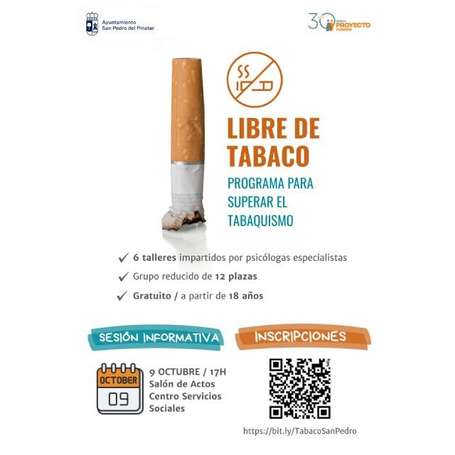 El Ayuntamiento de San Pedro del Pinatar y Proyecto Hombre unen sus fuerzas de nuevo en el “Programa de Superación del Tabaquismo”, un programa gratuito dirigido a adultos fumadores que residan en el municipio y que hayan tomado la decisión de dejar el tabaco.