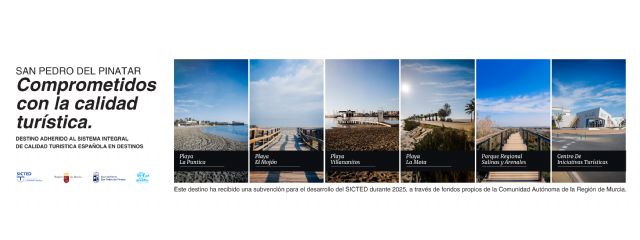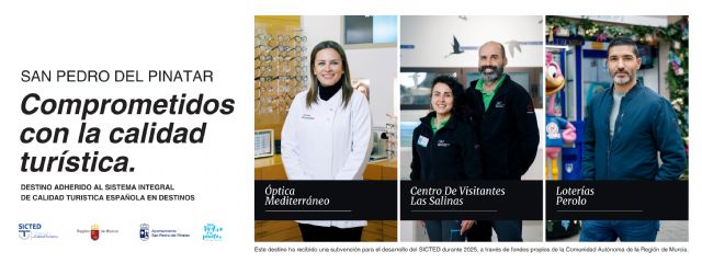 El municipio de San Pedro del Pinatar ha renovado y ampliado su presencia en 2025 en el sistema de calidad SICTED, incluyéndose en este sello de calidad tanto las playas del Mar Menor como el Parque Regional de Las Salinas, como la oficina de información Turística y el Centro de Visitantes, además de empresas de turismo activo, alquiler de vehículos, taxi, espacio escénico, comercios y hostelería, entre otros.